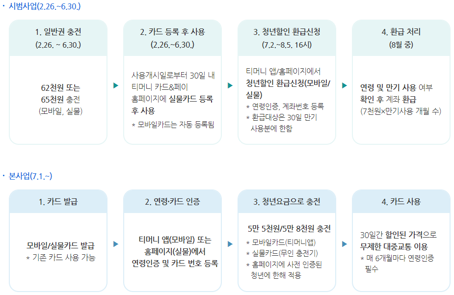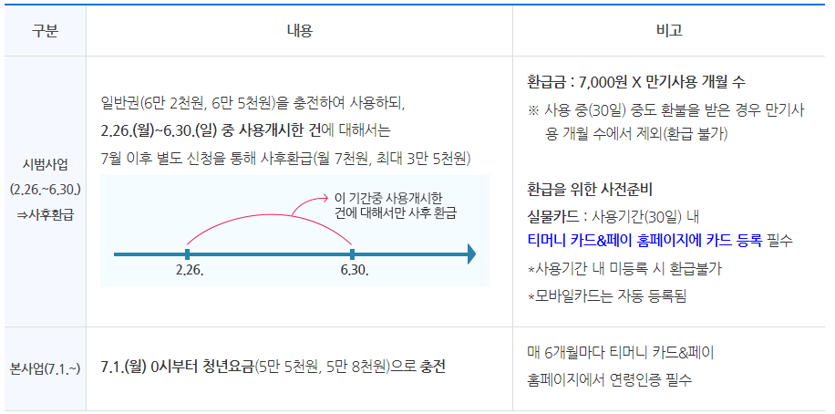 - 본사업(7.1일 이후) : 별도 청년요금(5만 5천원, 5만 8천원)으로 충전 가능