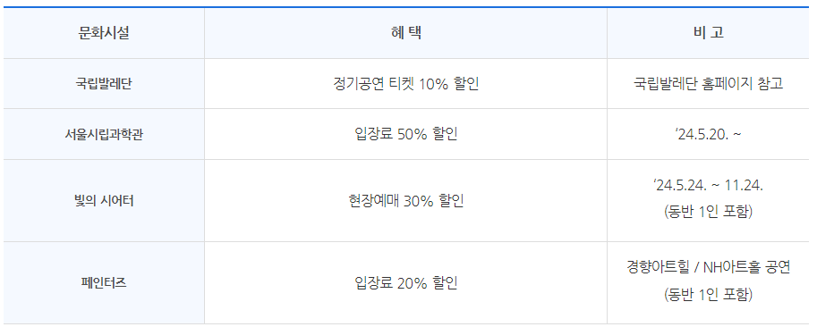 기후동행카드 소지자는 문화시설 입장시 아래와 같은 혜택을 제공받을 수 있습니다.